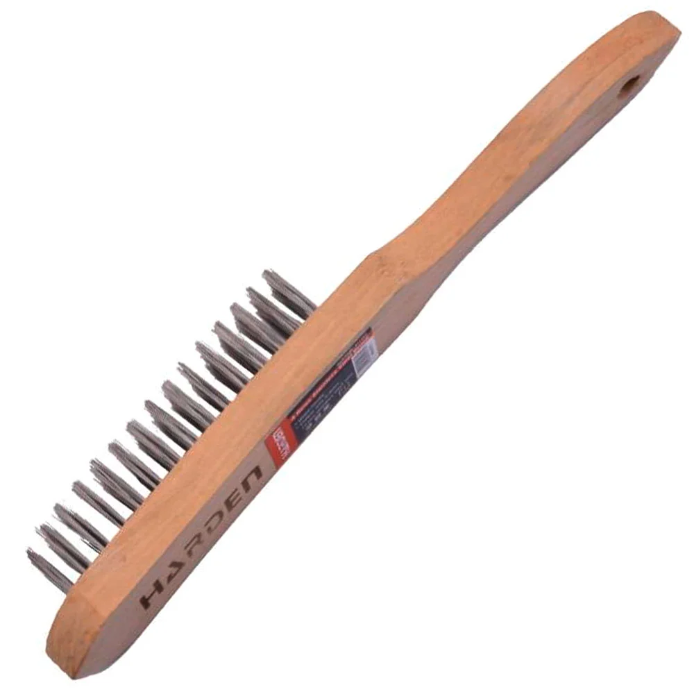 Escova resistente com cabo de madeira e cerdas de aço duro, ideal para limpeza pesada em superfícies metálicas. Perfeita para remoção de ferrugem, tinta e sujeiras difíceis, oferecendo firmeza e durabilidade no uso diário.