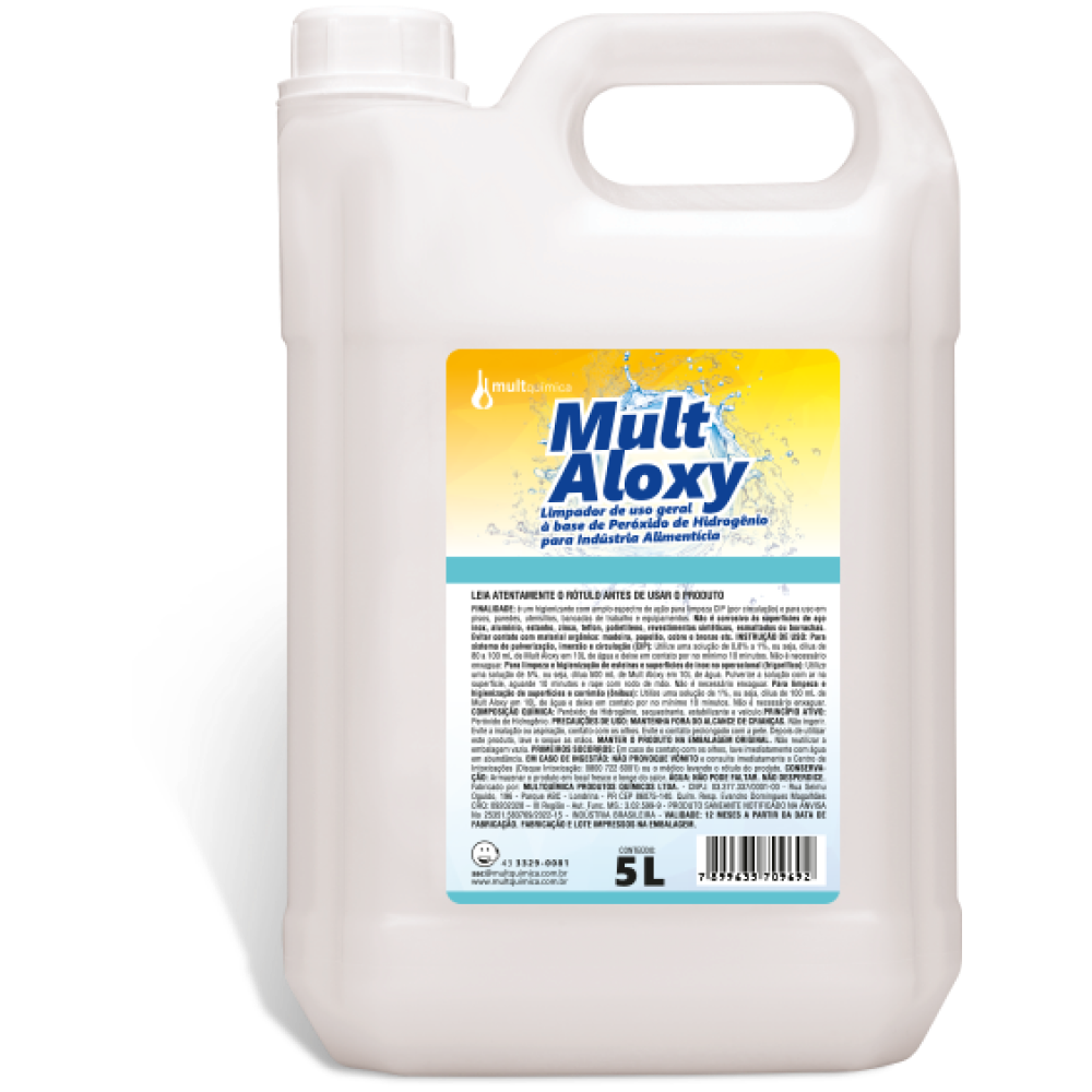 Mult Aloxy: Limpador de uso geral a base de peróxido de hidrogênio - especialmente formulado e aprovado para uso em indústrias alimentícias. Pode ser usado em limpeza CIP ou manual com esfregação. Para pisos, bancadas, paredes, equipamentos, tábuas de corte, etc.
