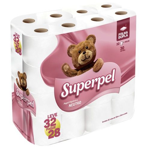 Papel higiênico folha dupla SUPERPEL macio, pacote com 32 rolos de 30 metros cada.